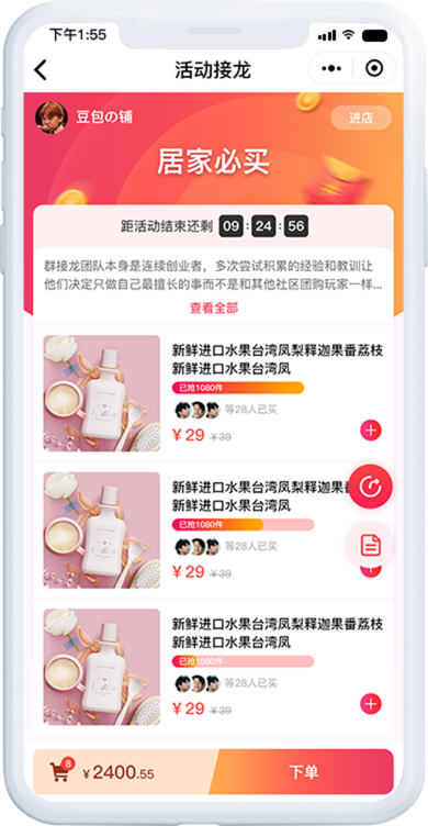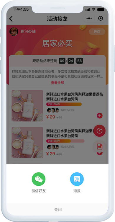 公众号、小程序接龙海报快速成生,实现微信群、朋友圈、线下扫码、 公众号多场景触达。