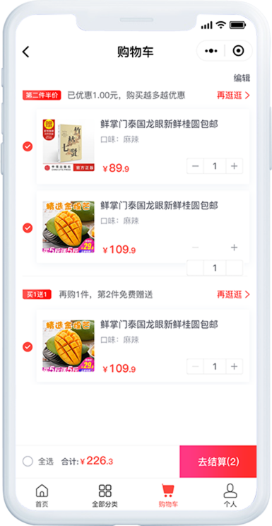 第N件打N折可设置第2件半价、买一赠一、自定义优惠 三种优惠方式,满足更多个性化需求;
