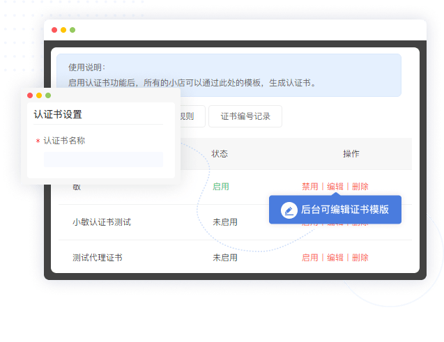 主商城后台可编辑资质认证书样式模板,成功开店的店长可在手机端获取保存该证书,证书编号可有序或随机生成且具有唯一性,大大增强了店长的归属感。