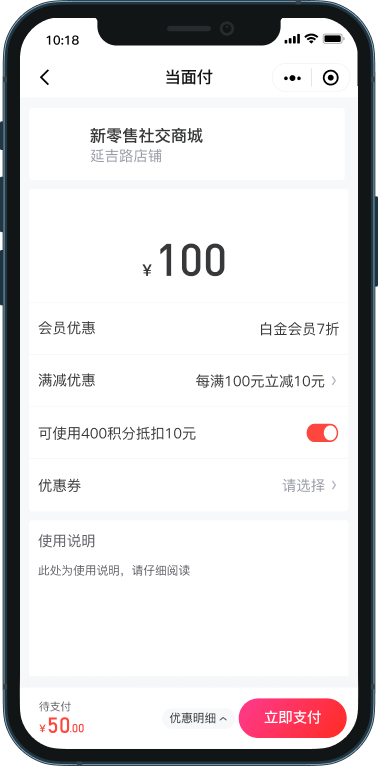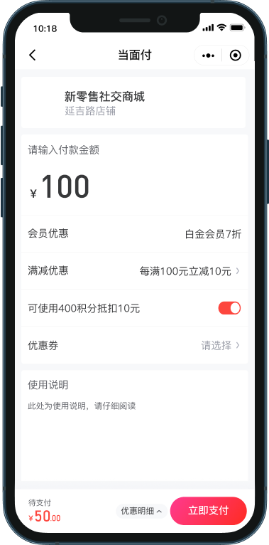 支持会员等级折扣、会员卡折扣、满减优惠、积分抵扣、优惠券、消费奖励等优惠叠加使用。